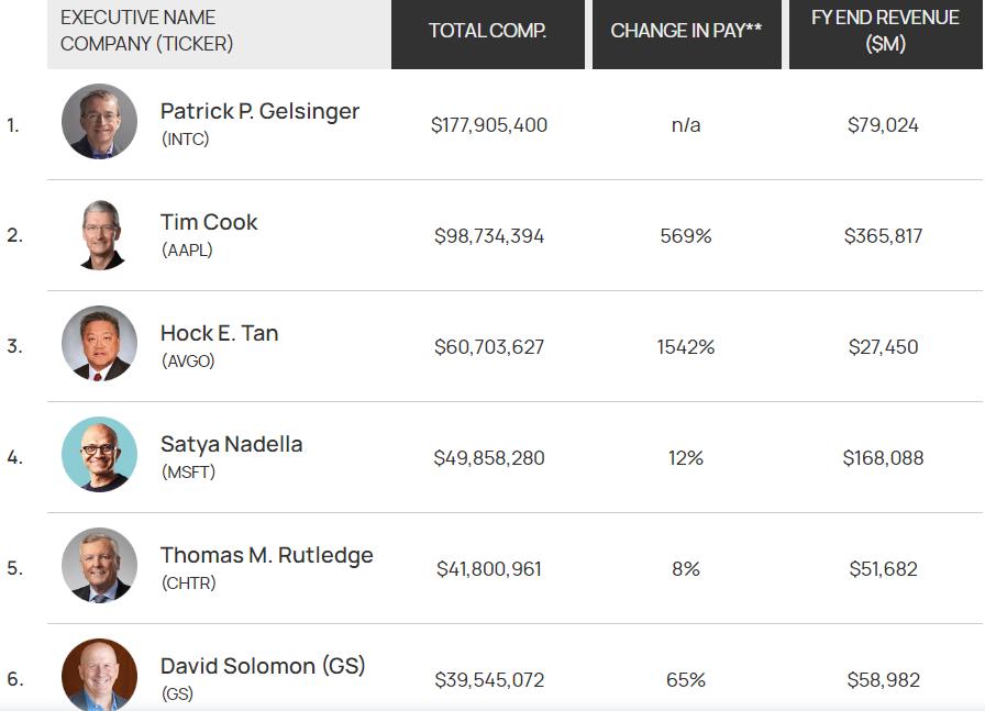 报告显示,英特尔CEO帕特·基辛格2021年的薪酬总额高达1.78亿美元,排名第一。之后依次为:苹果CEO蒂姆·库克为9870万美元,博通CEO陈福阳为6070万美元,微软CEO萨蒂亚·纳德拉高达4986万美元,特许通讯CEO托马斯·拉特里奇为4180万美元,高盛CEO戴维·所罗门为3955万美元。