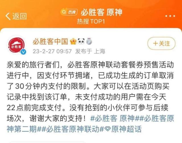 2月27日,必胜客与《原神》的二次联动,让自家必胜客APP又崩了,该话题一度冲上热搜榜第一名。此前,必胜客中国方面通过社交媒体回应称:必胜客原神联动套餐券预售活动进行中,因支付环节拥堵,已成功生成的订单取消了30分钟内支付的限制。大家可以在活动页购买记录中找到该订单,未支付成功的用户需在当天22点前完成支付;没有抢到的小伙伴可参与后续场次。