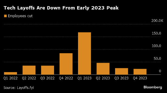 尽管迹象显示前景黯淡,但数据显示就业市场正在企稳。据追踪整个行业裁员情况的Layoffs.fyi,科技行业裁员人数在2023年第一季度见顶,此后稳步下降。据该网站计算,去年共有1186家科技公司裁员超过262600人。该网站显示,自1月1日以来,已有18家科技公司解雇了2945名员工。