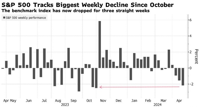 标普500指数预计将连续第三周下跌,因在一系列火热的通胀报告出炉后,投资者降低了对美联储降息的预期。亚特兰大联储主席博斯蒂克(Raphael Bostic)周四重申,他认为年底前降息都是不合适的。