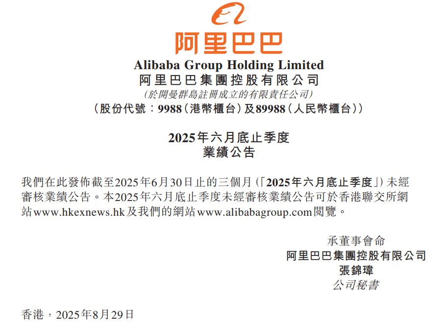 8月29日,阿里巴巴公告,2026财年第一季度(截至2025年6月30日止的三个月)营收2476.5亿元,同比增长2%,若不考虑高鑫零售和银泰的已处置业务的收入,同口径收入同比增长将为10%;第一季度调整后每ADS收益 14.75元;第一财季调整后EBITDA 457.4亿元。