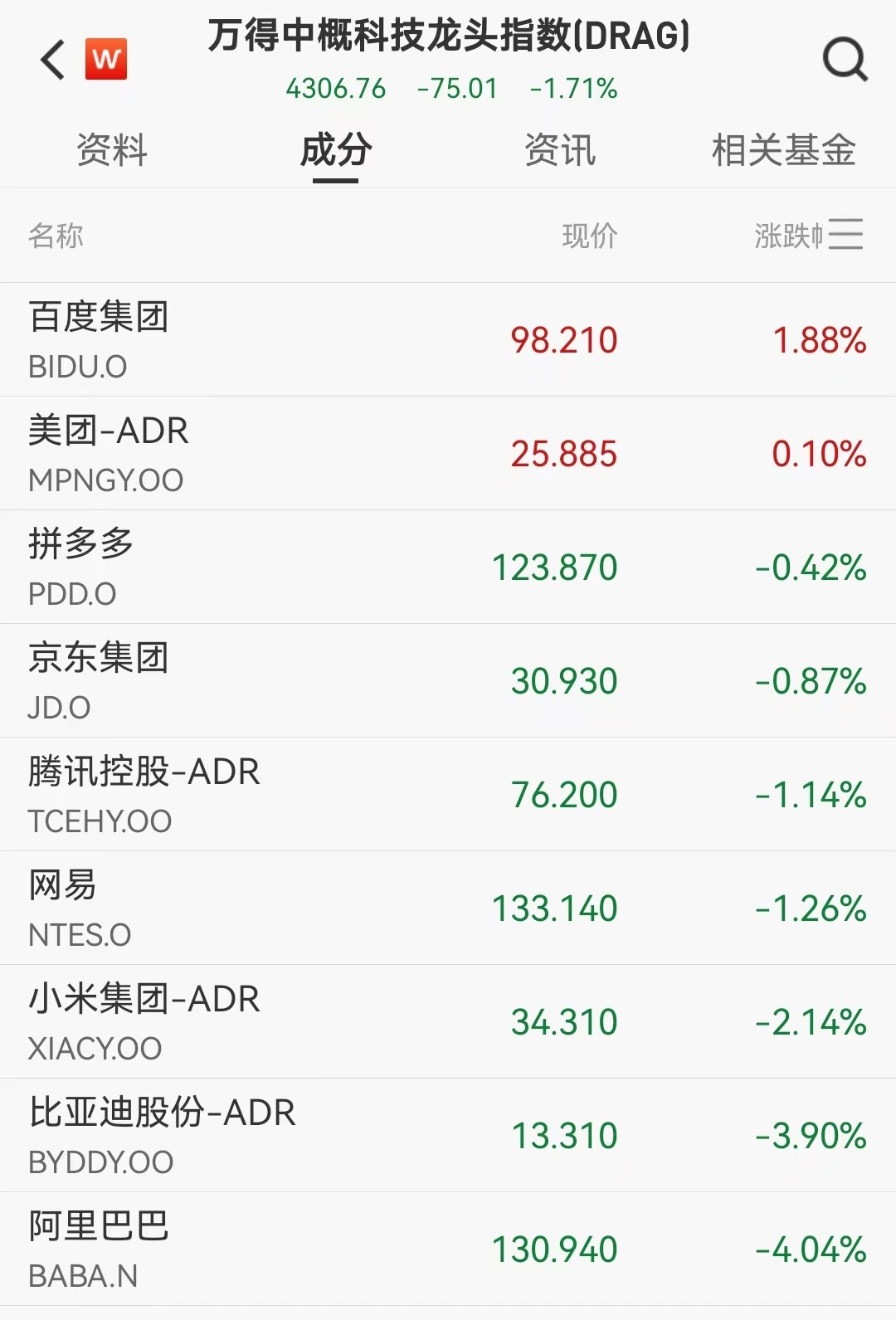 与美股本土科技股的狂欢形成鲜明对比的,是中概股的集体遇冷。纳斯达克中国金龙指数当日下跌1.11%,阿里巴巴跌超4%,蔚来跌逾3%,小鹏汽车跌超2%,百济神洲美股更是重挫超5%;仅有携程涨超2%、百度涨逾1%,成为少数逆势飘红的标的。