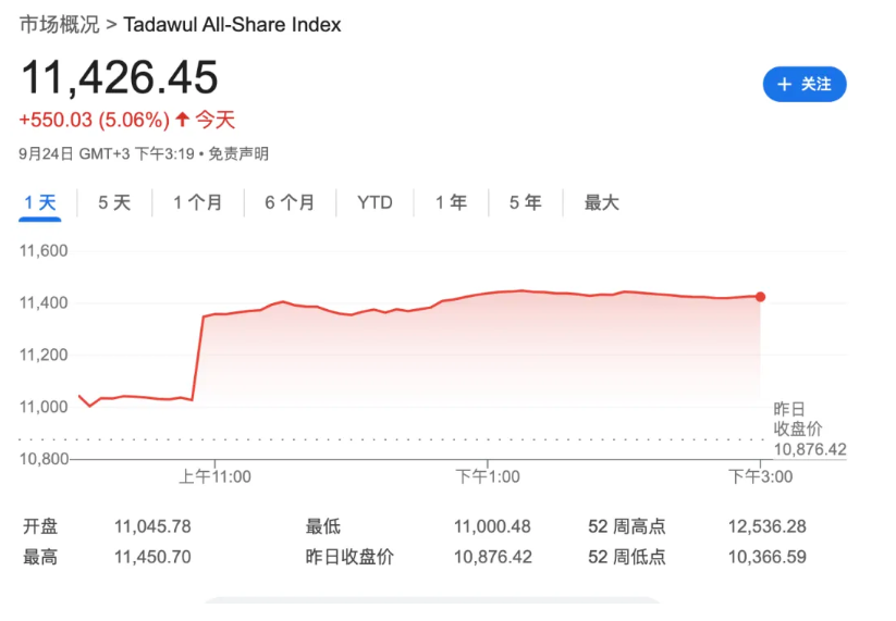 9月24日,沙特基准股指TASI飙升5%,创2020年以来最大涨幅。