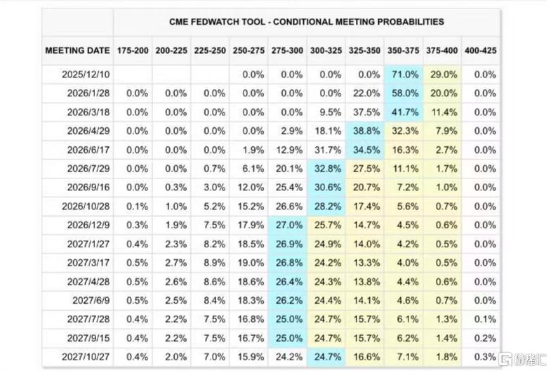 截至发稿,降息25个基点的概率为71%。,维持利率不变概率降至29%。