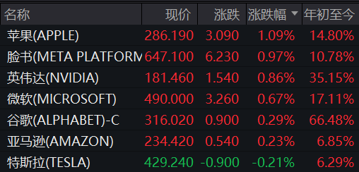 科技股成为此次反弹的领头羊。科技七巨头中,苹果涨1.09%,Meta涨0.97%,英伟达涨0.86%,微软涨0.67%,谷歌母公司Alphabet涨0.29%,亚马逊也小幅上涨。特斯拉虽略有下跌,但整体科技板块的强势表现仍为市场带来积极信号。