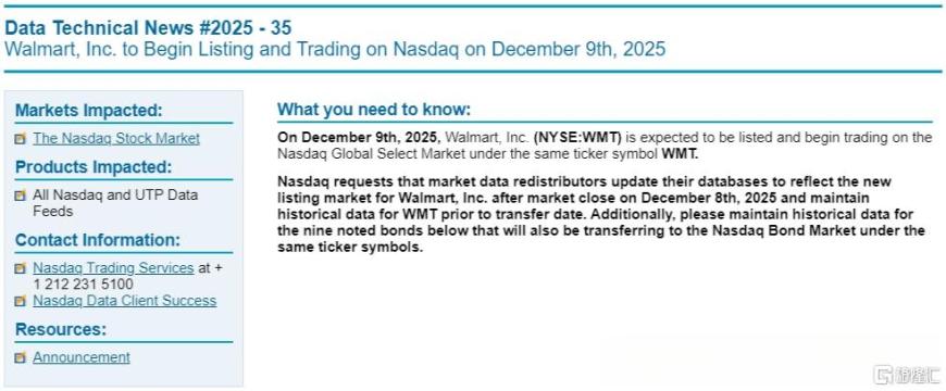 12月9日,全球最大零售商沃尔玛正式从纽交所转板至纳斯达克全球精选市场,股票代码WMT保持不变。