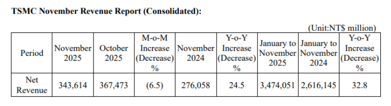 今年1月至11月累计营收达3.474万亿新台币,较2024年同期增长32.8%。