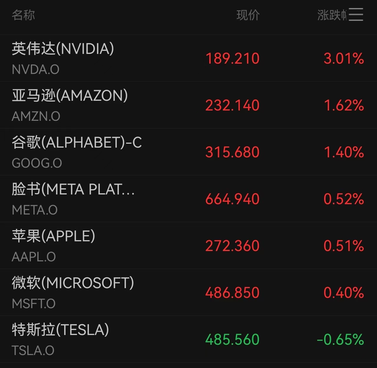 科技股成为市场主角,英伟达股价上涨3.01%,为标普500指数提供最大支撑;博通上涨2.30%,亚马逊上涨1.62%,谷歌涨幅也超过1%。苹果、微软和Meta小幅上涨,特斯拉则小幅下跌0.65%。人工智能相关股票延续反弹,扭转了上周因估值压力引发的回调。市场人士指出,资金正流向盈利确定性高的成长型龙头。