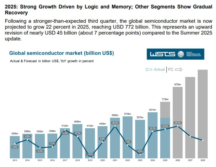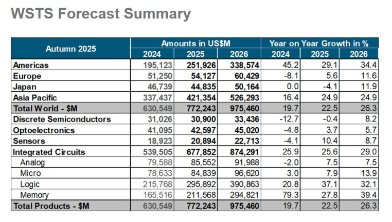 WSTS预计继2024年强劲反弹之后,2025年全球半导体市场将大幅增长22.5%,总价值将达到7722亿美元,高于WSTS春季给出的展望;2026年半导体市场总价值则有望在2025年的强劲增长基础之上大举扩张至9755亿美元,接近SEMI预测的2030年1万亿美金的市场规模目标,意味着有望同比大增26%。
