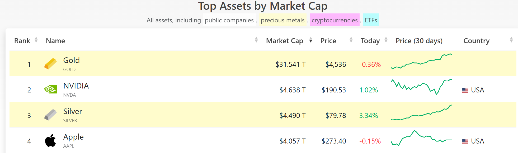 全球资产榜再刷新:白银跃居第三 剑指英伟达