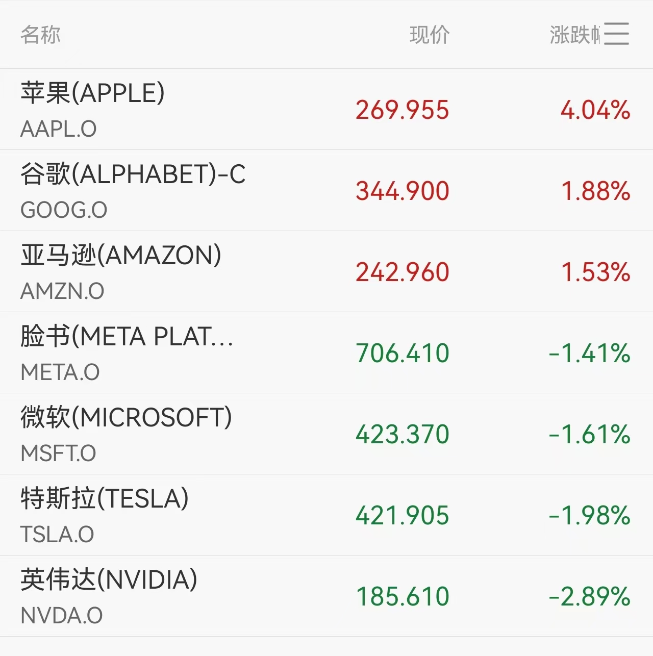 科技权重股走势分化。苹果涨超4%,谷歌、亚马逊涨幅均超1%,但英伟达跌近3%,特斯拉、微软、Meta跌幅在1%至2%之间。消息面上,谷歌旗下Waymo自动驾驶部门接近完成160亿美元融资,而甲骨文因筹资计划冲高回落。市场焦点转向本周密集财报,包括谷歌母公司Alphabet、亚马逊等128家标普500成分股将披露业绩,当前近八成已公布公司超预期。