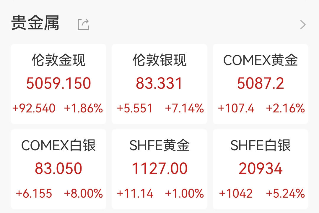 贵金属市场也同步走强,伦敦现货黄金突破5000美元/盎司关口,盘中一度涨超2%,COMEX黄金期货报5079美元/盎司,涨1.99%;伦敦现货白银涨超7%,COMEX白银期货一度涨超8%,报82.795美元/盎司,盘后涨幅进一步扩大至8%以上,逼近83.50美元/盎司。