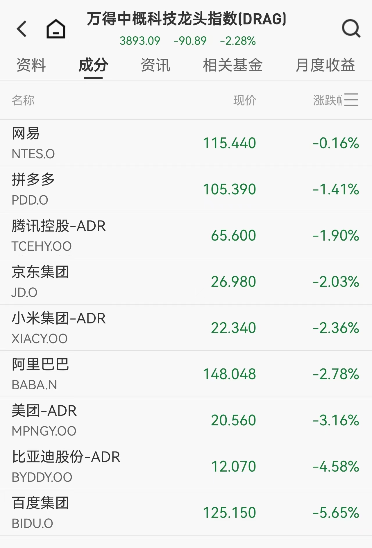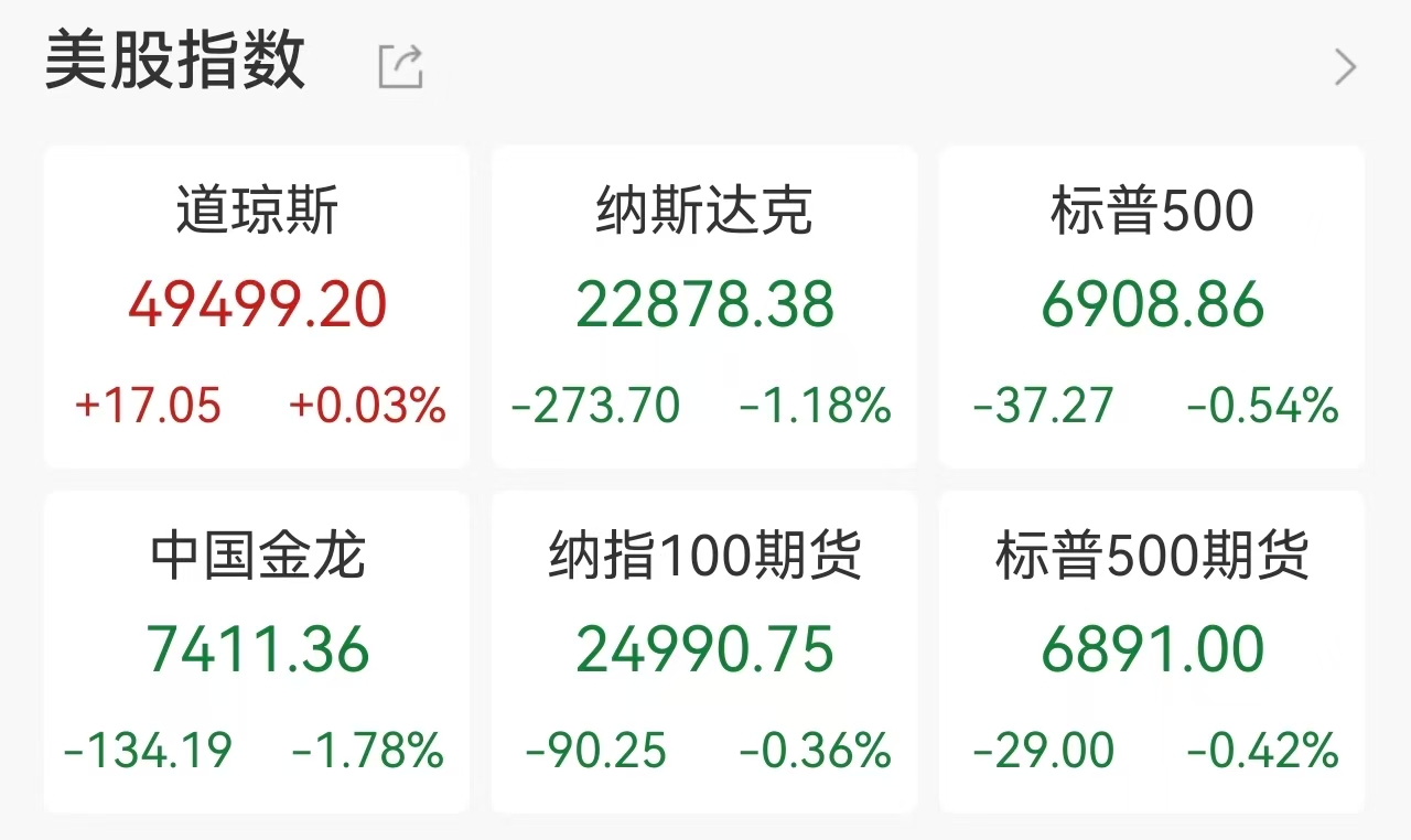 中概股亦多数下跌,纳斯达克中国金龙指数跌1.78%。百度、贝壳跌超5%,阿里巴巴、京东跌逾2%,但小马智行、华住集团等逆势上涨。