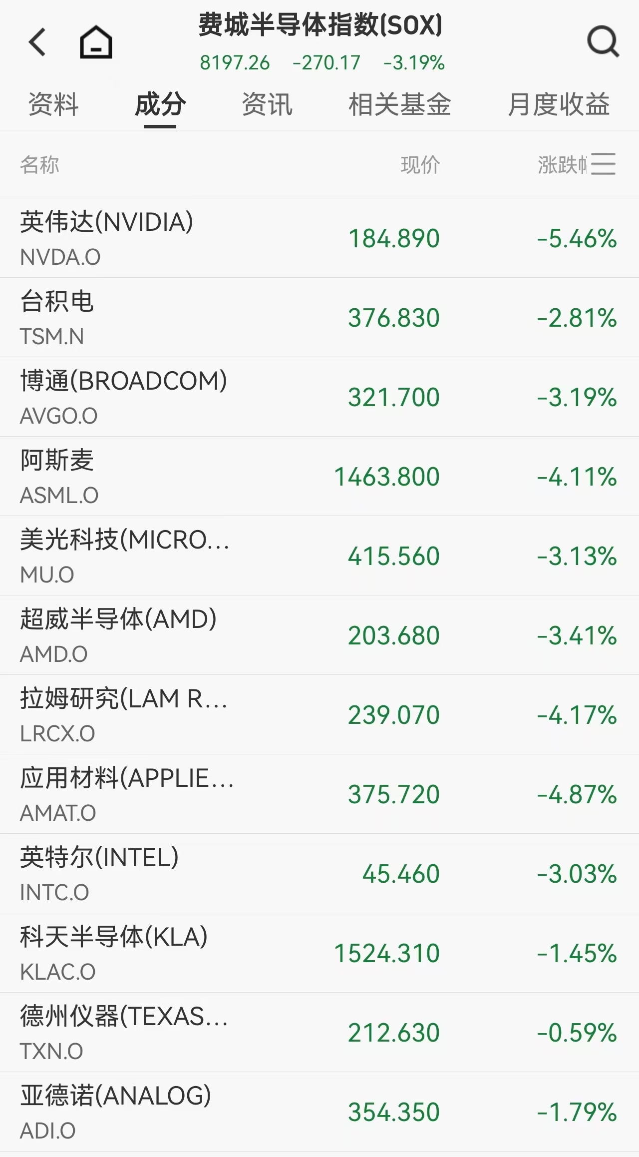 芯片股随之集体受挫。费城半导体指数跌3.19%,应用材料、阿斯麦、超威半导体等跌幅均超3%。