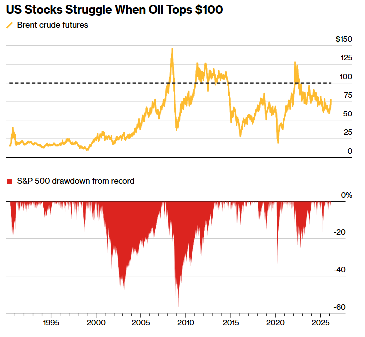 Bloomberg Intelligence策略师团队表示,从历史上看,只有当油价升至每桶100美元以上时,股票市场才真正会受到困扰。策略师们补充称,自1983年以来,在油价高于每桶100美元的时期之后一年内,标普500指数平均下跌1.6%;他们提到,如果霍尔木兹海峡长期关闭运输,一些华尔街分析师已将这一价位纳入预测模型。
