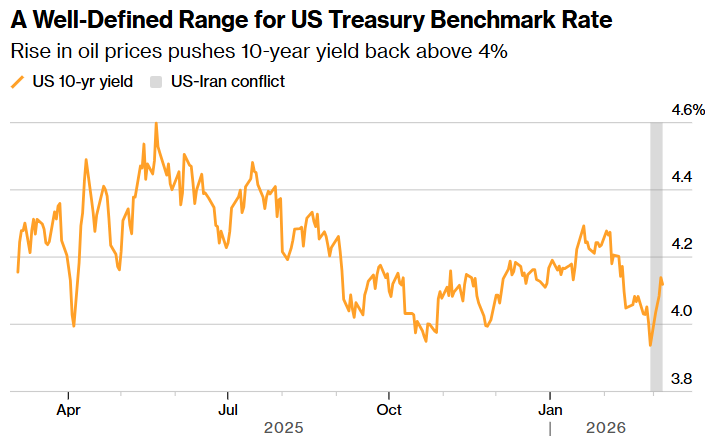 中东战事持续第二周,战争造成的人员伤亡和地缘政治影响依然是人们最为关注的问题。但对于规模达31万亿美元的美国债券市场的投资者而言,这场冲突也让一项原本看似简单的2026年关键交易变得更加复杂:投资者此前预期只需收取约4%的利息,然后等待美联储在新任主席的领导下恢复降息即可。尽管这一策略目前仍然有效,但风险正在上升,需要兼顾的因素也越来越多。周一亚洲交易时段,美国10年期国债收益率攀升至4.19%,今年以来已小幅走高。