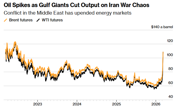 (海湾产油巨头因伊朗战争混乱而减产,油价飙升 来源:ICE、Nymex)