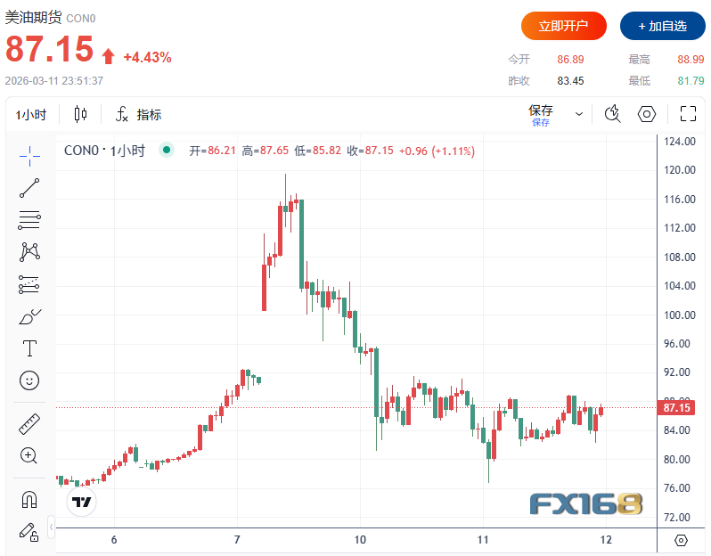 美市盘中,全球基准布伦特原油期货上涨4.4%,报91.66美元/桶,盘中一度逼近93美元/桶;美国WTI原油期货也上涨4.4%,报87.15美元/桶,稍早曾触及近89美元/桶高位。