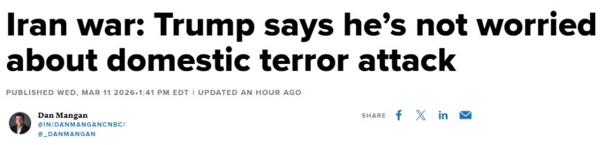 美国总统唐纳德·特朗普周三(3月11日)表示,他并不担心伊朗会为了报复美国和以色列正在进行的战争而在美国本土发动恐怖袭击。#伊朗危机追踪#