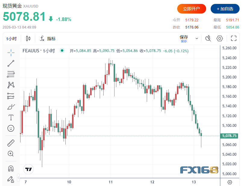 不过,随后金价迅速遭遇抛售,并于3月3日下跌逾6%,至5085美元/盎司附近。本周以来,随着冲突进一步升级,金价主要在5050美元至5200美元区间内波动。周四(3月12日)美市盘中,现货黄金持续走低并跌向5050美元关口,较日高回落近150美元。