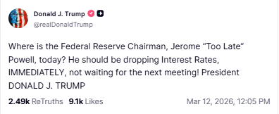 他在Truth Social上发文称:“美联储主席杰罗姆·‘太迟’·鲍威尔今天在哪里?他应该立刻降息,而不是等到下一次会议!”