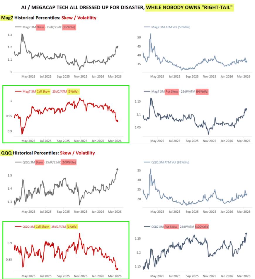 McElligott周三在提供给MarketWatch的评论中表示:“股票期权偏斜(尤其是超大盘科技股/‘美股七巨头’)依然极度偏向下行保护和虚值‘崩盘型’左尾对冲,而‘没有人持有右尾仓位’。”