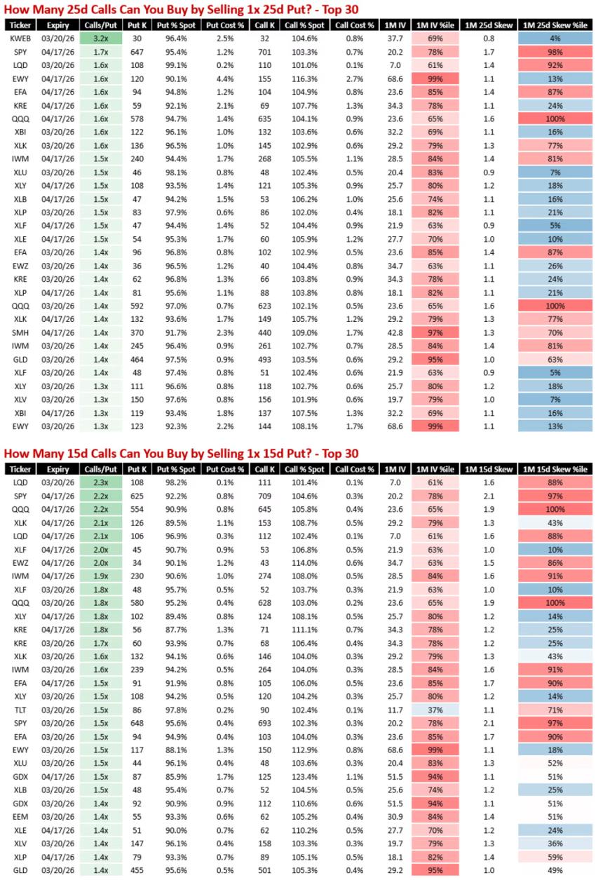 一张表格显示,通过卖出1份25Delta看跌期权可以买入的前30个看涨期权组合,以及通过卖出1份15Delta看跌期权可以买入的前30个看涨期权组合。