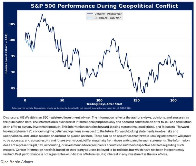 Adams在社交平台X上发文表示:“俄乌冲突爆发之初,股市也曾表现出‘韧性’。”她指出,2022年油价高位持续五周后,美股才最终屈服于通胀压力,开始大幅下挫。