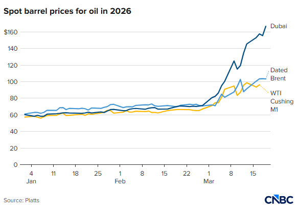 根据市场数据提供商普氏能源资讯(Platts)的数据,迪拜原油价格周四(3月19日)一度突破166美元/桶,创下历史新高。相比之下,国际基准布伦特原油和美国WTI原油目前仍徘徊在100美元/桶附近,尽管二者此前也已经历了罕见的快速上涨。
