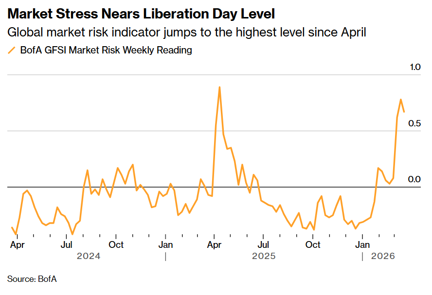 根据美国银行的一项指数,巨大的跨市场压力正以自去年关税冲击以来最快的速度累积。基于利率下行预期建立的股票和信贷交易正在同步且迅速平仓,新兴市场正在不断承压。
