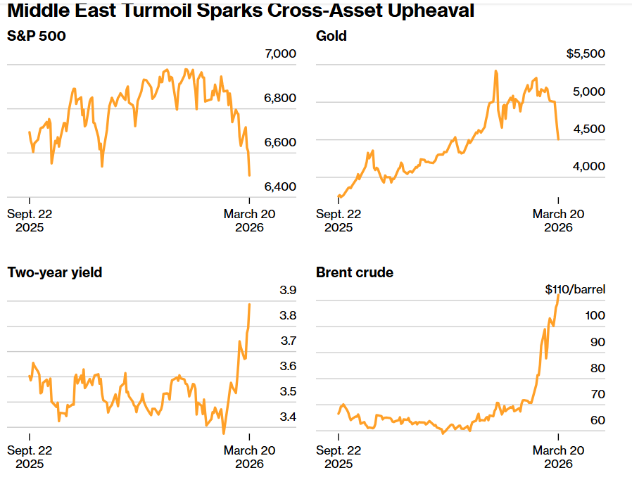跟踪标普500指数、长期美国国债和黄金的ETF均录得自战争爆发以来最糟糕的综合表现周。如上图所示的那样,中东地缘政治动荡已经引发跨资产剧烈波动。