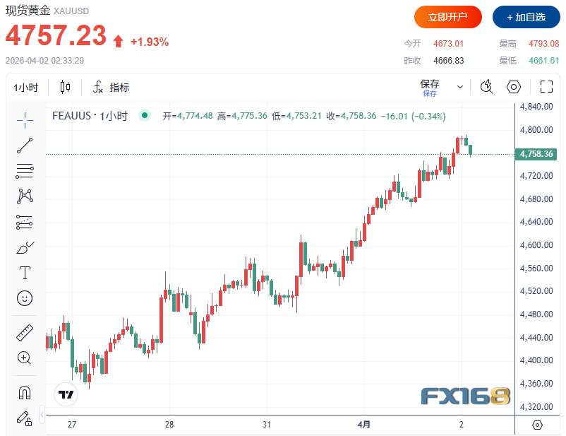 这一目标位意味着,金价较当前水平仍可能再下跌约20%。目前,现货黄金报4757.23美元,日内涨幅达近2%,日内稍早一度触及4793.08美元高点。