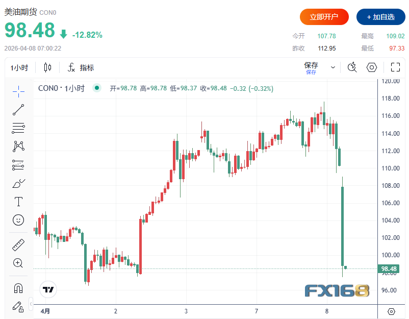 与之形成鲜明对照的是,原油价格显著下挫。WTI原油日内重挫超13%,跌破100美元/桶。油价的回落,说明市场已开始部分消化霍尔木兹海峡恢复部分通行、或至少不会立即出现更严重供应冲击的预期。