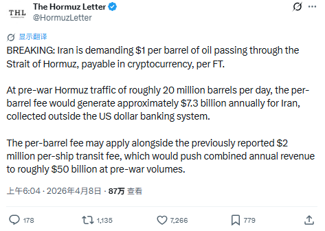 在美国与伊朗达成为期两周停火协议后,霍尔木兹海峡的通行安排再现新变数。伊朗方面表示,所有在停火期间通过霍尔木兹海峡的船只,都将按所载原油数量支付相当于每桶1美元的加密货币通行费,而付款方式将采用比特币结算。#伊朗危机追踪#