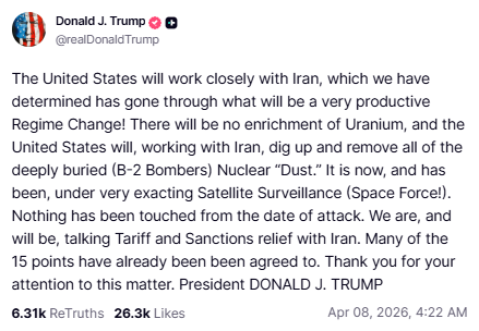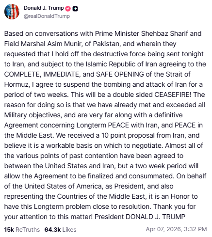 特朗普在Truth Social上发文称:“我同意暂停对伊朗的轰炸和攻击两周。我们收到了伊朗提出的一份10点方案,并认为这可以作为谈判的可行基础。”#伊朗危机追踪#