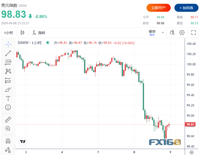 在停火协议提升市场风险偏好的同时,汇市也出现明显调整。美元周三对一篮子主要货币下跌,美元指数连续第三个交易日回落,最低触及98.53,为至少3月11日以来的最低水平。此前因中东战争而受益的美元避险买盘开始部分撤出。