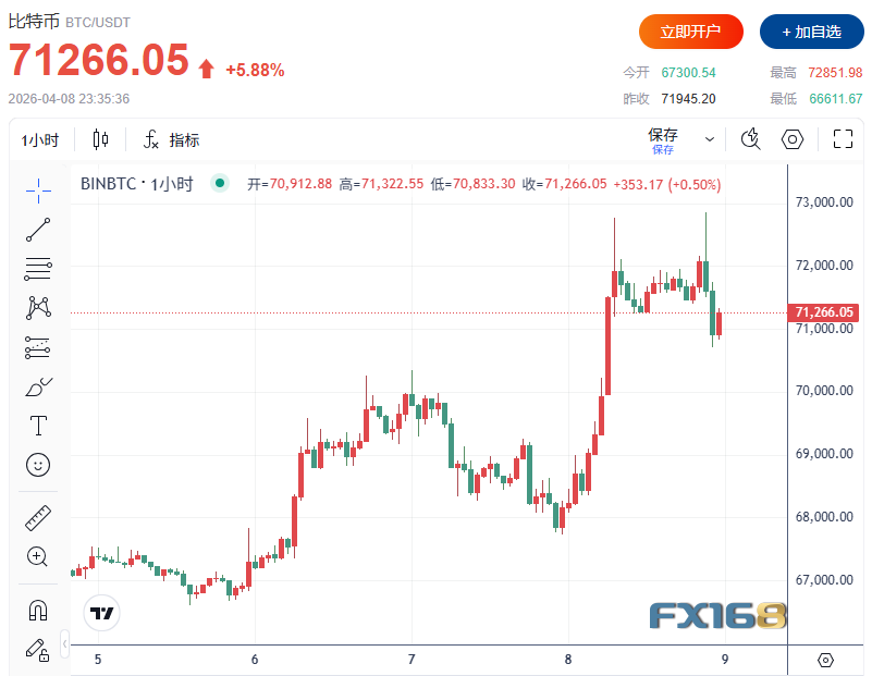在停火消息以及霍尔木兹海峡可能恢复通行的背景下,加密货币市场也同步上涨。比特币一度升破72700美元,随后回吐部分涨幅,但仍上涨近6%,维持在71266美元一线。Solana和以太坊分别上涨7%和8%,尽管盘中同样较高位有所回落。
