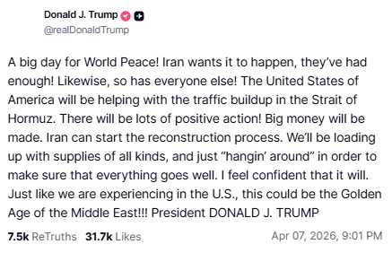 特朗普写道:“将会有很多积极行动!很多钱会被赚到。伊朗可以开始重建进程。我们将装载各种物资,并且会‘留在那儿’,确保一切顺利进行。我对此很有信心。”