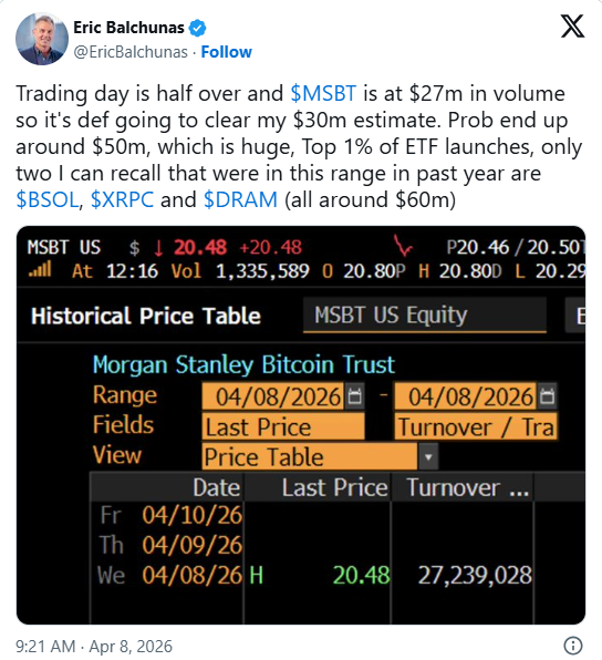 摩根士丹利这只比特币现货ETF于周三(4月8日)正式开始交易,盘初表现活跃。数据显示,该基金首日成交量超过160万股,录得约3400万美元资金流入,显示出较为稳健的初始需求。