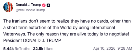 美国总统特朗普周五在Truth Social上指责伊朗“利用国际水道对全世界进行短期勒索”,并称伊朗领导人“似乎没有意识到他们并没有任何筹码”,还表示“他们今天之所以还能活着,唯一原因就是为了谈判!”