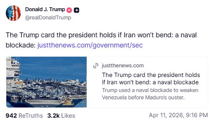 特朗普转发的文章来自Just the News,标题为:“The Trump card: President holds if Iran won’t bend - naval blockade (特朗普手中的王牌:如果伊朗不让步,总统仍握有一张牌——海上封锁)”