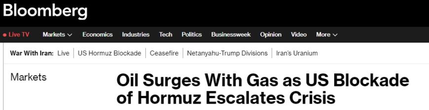 周一(4月13日)亚市盘初,由于华盛顿与德黑兰在周末的会谈未能达成协议,美国决定封锁霍尔木兹海峡,全球能源危机因此加剧,推动油气价格暴涨。
