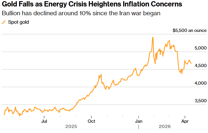 (能源危机加剧通胀担忧,金价下跌 来源:彭博)