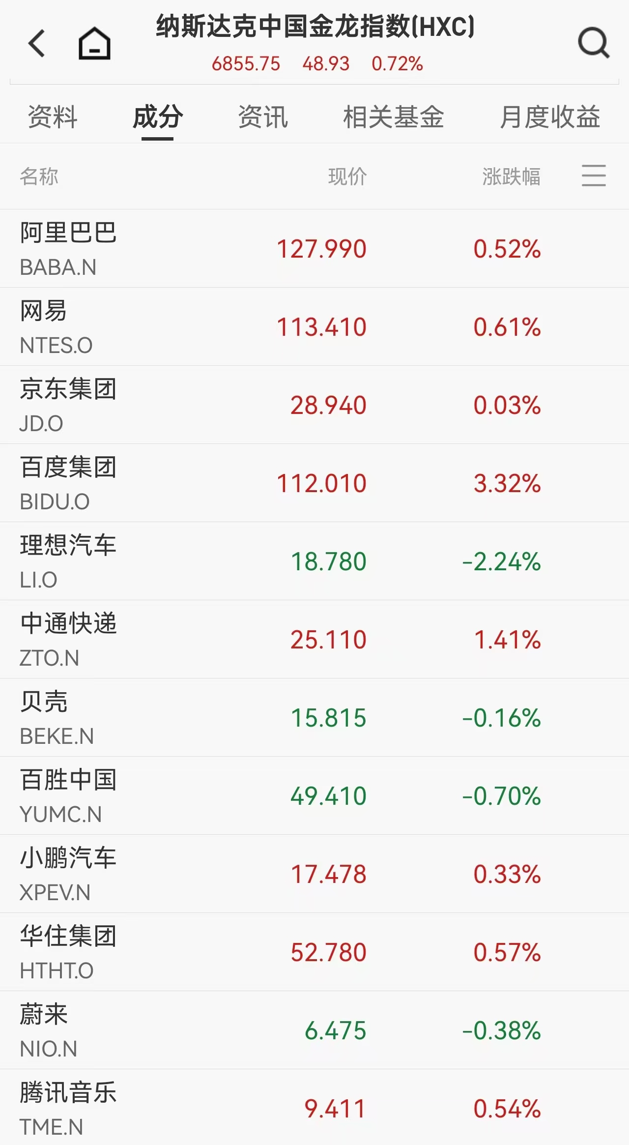 中概股多数上涨,纳斯达克中国金龙指数收涨0.72%。热门个股中,金山云涨超6%,小马智行涨超5%,百度集团涨超3%,哔哩哔哩涨近3%。下跌阵营中,理想汽车跌超2%。