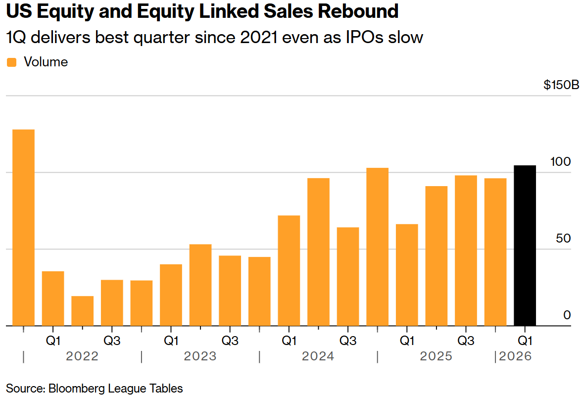 承销费用的激增源于第一季度整体健康的交易活动,尽管在此期间,由于美以与伊朗之间的战争,市场出现了剧烈波动且波动率飙升。即便美国 IPO 市场有所放缓(3 月份的交易量降至近一年来的最低水平),银行高管们仍预测反弹指日可待。